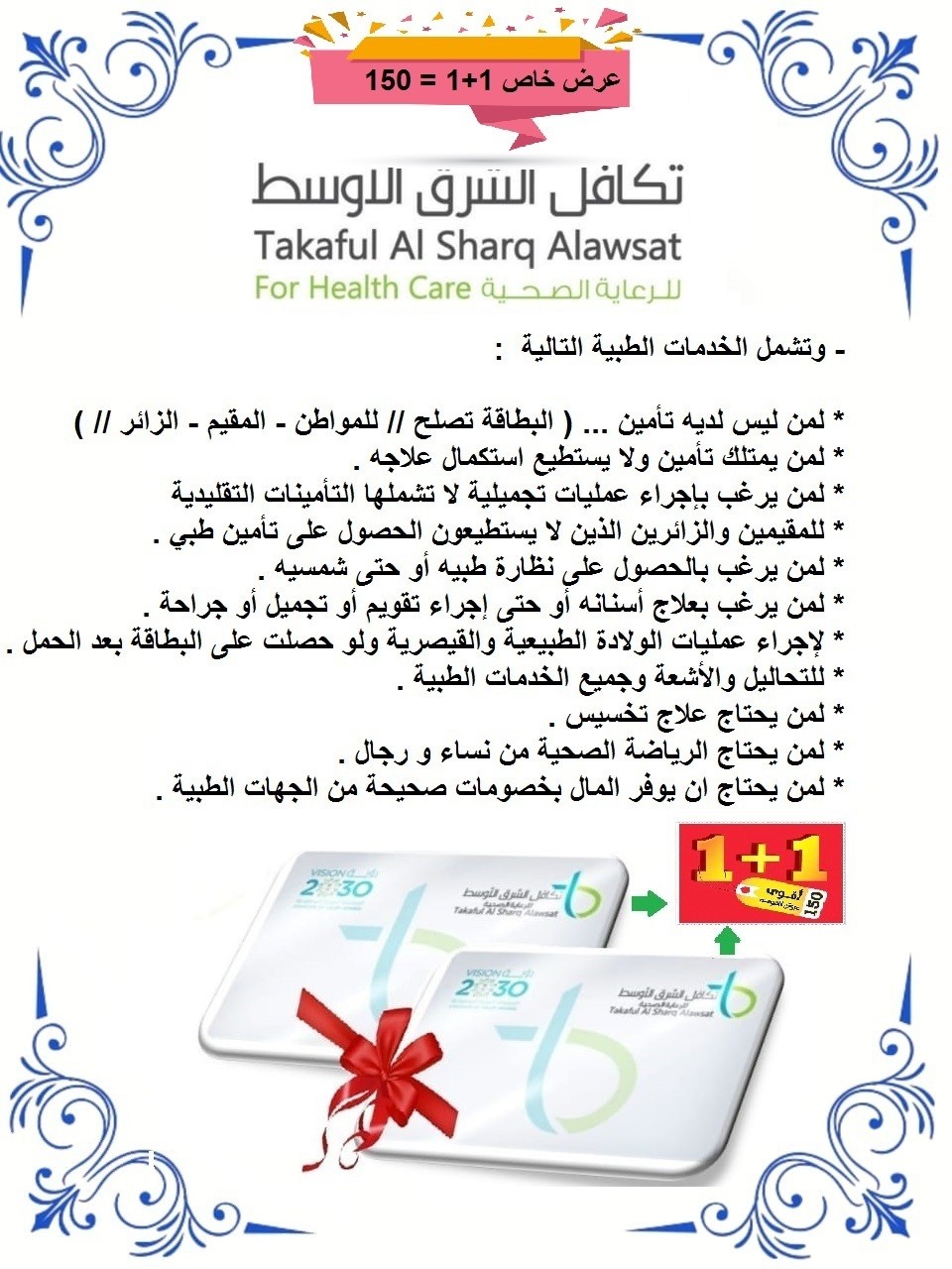 https://i.suar.me/yygVn/l احصل على بطاقة تكافل الشرق الاوسط الأن عرض لفتره محدود ( 1+1 = 150 ) تعتبر بطاقة تكافل الشرق الأوسط البطاقة الأشهر والأقوى في مجال الخصومات الطبية. حيث تقدم البطاقة خصم حقيقي يصل الى ما يزيد عن 80% واللان العرض الاقوى بطاقتين بقيمة بطاقه اي احصل على بطاقه 150 ومعاها بطاقه اخرى اطلبها و الدفع عند الاستلام مع شحن مجاني لجميع أنحاء المملكه للطلب و الاستفسار تواصل واتساب : 0544893442 https://api.whatsapp.com/send?phone=00966544893442 https://i.suar.me/moNeN/l |