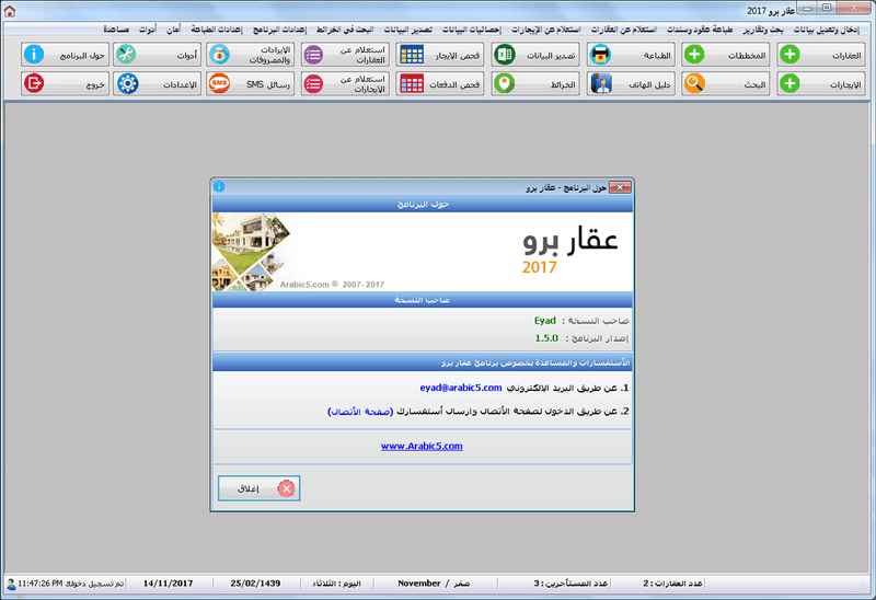 برنامج عقار برو تستطيع من خلاله التحكم بعقاراتك والإيجارات والمخططات بالإضافة إلى الإيرادات والمصروفات والعقود والسندات. تستطيع من خلال البرنامج عمل التالي: – إضافة عقود البيع والشراء وطباعتها. – إضافة عقود إيجار المستأجرين وطباعتها. – إضافة سندات القبض والصرف وطباعتها. – إضافة العقارات المباعة والمتاحة وطباعتها. – إضافة الإيجارات والمستأجرين والأقساط المتعلقة بهم وطباعتها. – إضافة المخططات وطباعتها. – إضافة الإيرادات وطباعتها. – إضافة المصروفات وطباعتها. – إضافة أرقام الهواتف والبيانات لدليل الهاتف لكل مستأجر أو صاحب عقار وطباعتها. – نافذة لتفحص الإيجارات المشرفة على الانتهاء أو المنتهية (بشكل أوتوماتيكي أو اختياري) وطباعتها. – نافذة لإدارة وإرسال رسائل SMS. – نافذة خاصة بتصفح ومشاهدة وحفظ خرائط جوجل. – تصدير بيانات العقارات لبرنامج الإكسل. – تصدير بيانات الإيجارات لبرنامج الإكسل. – تصدير بيانات المخططات لبرنامج الإكسل. – تصدير بيانات الإيرادات لبرنامج الإكسل. – تصدير بيانات المصروفات لبرنامج الإكسل. – تصدير بيانات سجلات الهاتف لبرنامج الإكسل. – نافذة خاصة بطباعة جميع العقود والسندات. – نافذة خاصة بإحصائيات جميع البيانات وطباعتها. – طباعة النتائج النهائية لمجموع الإيرادات والمصروفات. – يمكنك طباعة جميع البيانات الخاص بالعقارات والإيجارات والمخططات. – نافذة معلومات مفصلة لمعرفة: – العقارات المباعة. – العقارات الغير مباعة. – نافذة معلومات مفصلة لمعرفة: – الإيجارات المؤجرة. – الإيجارات الغير المؤجرة. – الإيجارات المشرفة على الانتهاء. – الإيجارات المنتهية. – بحث سريع بنافذة العقارات. – بحث سريع بنافذة الإيجارات. – نافذة بحث مفصل للعقارات. – نافذة بحث مفصل للإيجارات. – تستطيع البحث قي سجلات دليل الهاتف. – تستطيع البحث في سجلات المخططات. – تستطيع التحكم في إعدادات شعار وبيانات المؤسسة أو المكتب أو الشركة وإضافة صورة خلفية للبرنامج. – تستطيع إظهار بيانات المؤسسة في الطباعة أو إلغائها من خلال نافذة إعدادات البرنامج. – تستطيع التحكم في إظهار رسالة تنبيه للإيجارات المشرفة على الانتهاء. – تستطيع طباعة ورقة خاصة بالمكتب أو الشركة. – تستطيع إختيار نظام التاريخ (الهجري أو الميلادي) – تستطيع التحكم بعدد الأيام الخاصة بالإيجارات المشرفة على الانتهاء أو المنتهية. – تستطيع التحكم بعملة البرنامج واختيار ما تريد مثل (ريال أو درهم أو ليرة أو دينار الخ) أو غير ذلك. – تستطيع التحكم وإضافة وحذف ( أنواع العقارات – أنواع الإيجارات – أسماء المدن أو المناطق – الجنسيات) – تستطيع وضع شروط عقد الإيجار والتعديل عليها. – تستطيع وضع شروط عقد البيع والشراء والتعديل عليها. – تستطيع التحكم بالنسخ الاحتياطية لقواعد البيانات الخاصة بالبرنامج وحفظها في نفس مجلد البرنامج أو حفظ النسخة الاحتياطية في مكان آخر. – تستطيع التحكم بألوان الطباعة و ضبط الألوان الذي تريدها من خلال نافذة إعدادات البرنامج. – تستطيع تعديل ألوان الإيجارات الغير مؤجرة و الإيجارات المشرفة على الأنتهاء و المنتهية. + تقرير عن العقارات المباعة. + تقرير عن العقارات المطلوبة. + تقرير عن العقارات المعروضة. + تقرير عن العقارات المؤجرة. + تقرير عن العقارات الغير مؤجرة. + تقرير عن العقارات المشرفة على الإنتهاء. + تقرير عن العقارات المنتهية. + تقرير عن الإيرادات + تقرير عن المصروفات + تقرير عن سندات القبض + تقرير عن سندات الصرف + تصدير بيانات العقارات + تصدير بيانات الإيجارات + تصدير بيانات المخططات + تصدير بيانات سجلات دليل الهاتف + تصدير بيانات الإيرادات + تصدير بيانات المصروفات + استعلام عن العقارات: استعلام عن العقارات المطلوبة استعلام عن العقارات المعروضة + استعلام عن الإيجارات: استعلام عن العقارات المؤجرة استعلام عن العقارات الغير مؤجرة استعلام عن الإيجارات المشرفة على الإنتهاء استعلام عن الإيجارا