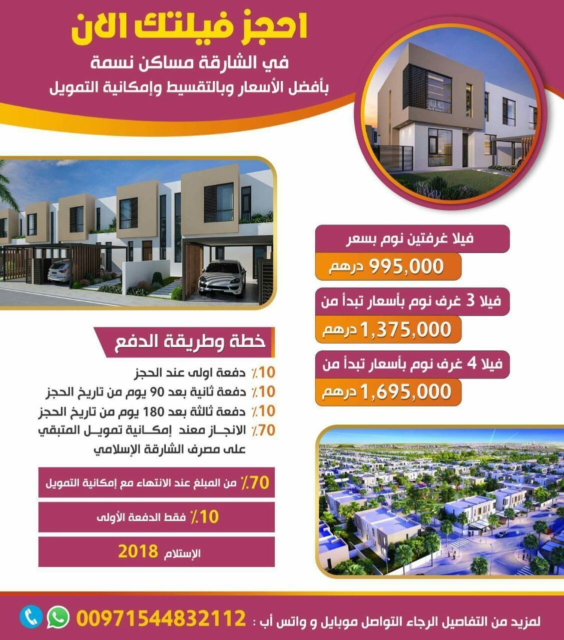 http://i.suar.me/j8Pm1/l احجز فيلتك الان في الشارقة مساكن نسمة بافضل الاسعار وبالتقسيط وامكانية التمويل. للاستعلام والاتصال او واتس اب : 00971544832112 أحدث التصاميم في أجواء عائلية مميزة للباحثين عن الاستثمار في منطقة الطي مشروع مساكن نسمه السكني لجميع الجنسيات من شركة أراد للتطوير العقاري. فيلا غرفتين نوم بسعر 995,000 درهم فيلا 3 غرف نوم بأسعار تبدأ من 1,375,000 درهم فيلا 4 غرف نوم بأسعار تبدأ من 1,695,000 درهم تحتوي جميع الفلل طابقين مكونة من غرف نوم ومطبخ ومعيشة وغرفة طعام وغرفة خادمة و مواقف سيارات يحتوي المشروع على مراكز تسوق ومساجد و مدارس و حدائق ومراكز رياضية و مركز صحي بالاضافة الى ان جميع رسوم الصيانة و الخدمات مجاناً مدى الحياة و تملك حر مدى الحياة لجميع الجنسيات. خطة و طريقة الدفع: 10% دفعة اولى عند الحجز 10% دفعة ثانية بعد 90 يوم من تاريخ الحجز 10% دفعة ثالثة بعد 180 يوم من تاريخ الحجز 70% عند الانجاز مع إمكانية تمويل المتبقي على مصرف الشارقة الاسلامي ويعتبر مشروع مساكن نسمة في الشارقة مشروعا مشتركا بين رئيس مجلس إدارة KBW للاستثمارات الأمير خالد بن الوليد بن طلال، ورئيس مجلس إدارة مجموعة بسمة الشارقة "بسمة" الشيخ سلطان بن أحمد القاسمي رئيس مجلس للاستعلام والاتصال او واتس اب : 00971544832112 Sizes : 2 BR 1503 Sq.ft BUA plot size : 1469 sq.ft 3 BR starts 1986 BUA up to 2306 sq.ft Plot size : 1921 up to 2600 sq.ft 4 BR starts 2624 BUA up to 3086 sq.ft Plot size : 3277 up to 5106 sq.ft |