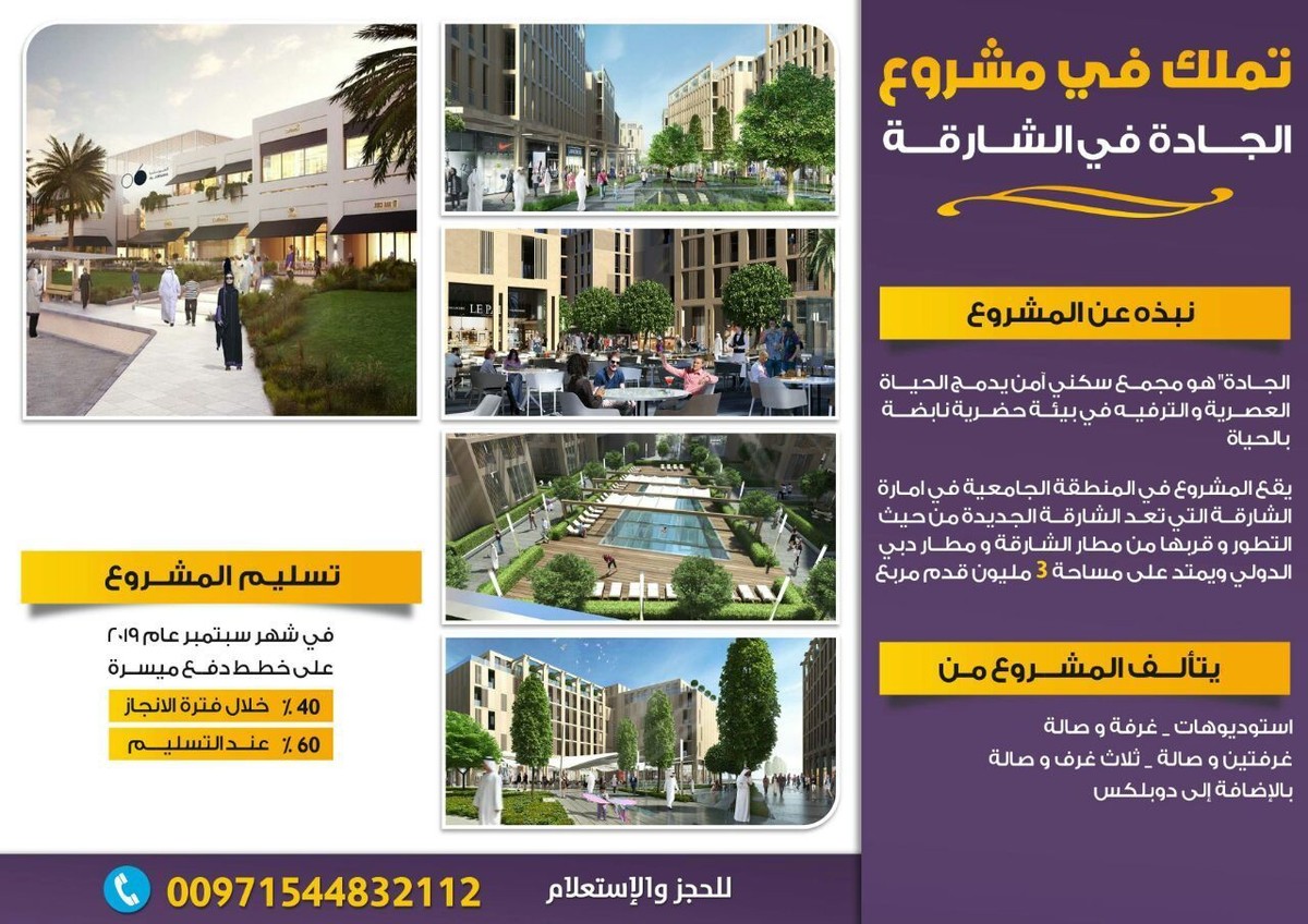 سارع بتملك شقتك في مشروع الجادة بالشارقة من شركة أرادا للتطوير العقاري وبالتقسيط المريح https://i.suar.me/xE43Q/l للاستعلام والاتصال او واتس اب :00971544832112 تحت رعاية وحضور صاحب السمو الشيخ سلطان بن محمد القاسمي عضو المجلس الأعلى حاكم الشارقة . تم بحمد الله إطلاق الواجهة الجديدة العصرية للشارقة في منطقة الشارقة الجديدة ( مشروع الجادة العقاري ) يتضمن المشروع إطلاق شقق سكنية استوديو غرفة وصالة غرفتين وصالة ثلاث غرف وصالة وفلل وتاون هاوس من غرفتين وثلاث غرف خطط دفع ميسرة تبدأ من ١٠٪ فقط مع إمكانية التمويل البنكي بالشراكة مع مصرف الشارقة الاسلامي نبذة عن المشروع: الجادة" هو مجمع سكني آمن يدمج الحياة العصرية ووالترفيه في بيئة حضرية نابضة بالحياة. يقع المشروع في المنطقة الجامعية في امارة الشارقة التي تعد الشارقة الجديدة من حيث التطور و قربها من مطار الشارقة و مطار دبي الدولي ويمتد على مساحة 3 مليون قدم مربع. يضم المشروع خدمات ترفيهية و ثقافية(مقاهي، مطاعم، ممشى، نوادي صحية، حدائق و حضانة للأطفال) . يتألف المشروع من استوديوهات، غرفة و صالة، غرفتين و صالة، ثلاث غرف و صالة ، بالضافة الى دوبلكس. تسليم المشروع سيكون في شهر سبتمبر عام 2019 و على خطط دفع ميسرة 30% خلال فترة الانجاز و 70% عند التسليم مع إمكانية التمويل عن طريق بنك مصرف الشارقة الاسلامي دراسة المشروع: المشروع هو من أهم المشاريع الاستثمارية في المنطقة حيث يقع في المنطقة الجامعية التي تضم 30000 طالب و معلم و مقابل ثاني أكبر ستي سنتر في الامارات الذي سيضم 10000 موظف ما يزيد الطلب على الشقق السكنية الفاخرة في هذا الموقع. ويعتبر مشروع الجادة في الشارقة مشروعا مشتركا بين رئيس مجلس إدارة KBW للاستثمارات الأمير خالد بن الوليد بن طلال، ورئيس مجلس إدارة مجموعة بسمة الشارقة "بسمة" الشيخ سلطان بن أحمد القاسمي للاستعلام والاتصال او واتس اب : 00971544832112 |