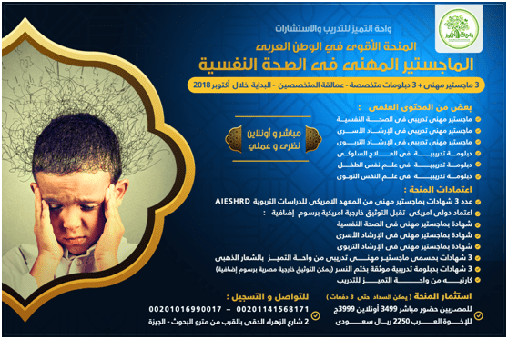 أضخم ماجستير مهنى فى الصحة النفسية +الماجستير المهنى فى الإرشاد الأسرى +الماجستير المهنى فى الإرشاد التربوى + 3 دبلومات مهنية فى : ( 1 - العلاج السلوكى + 2- علم نفس الطفل + 3- علم النفس التربوى ) حصريا من واحة التميز للتدريب - مباشر و أونلاين - عمالقة المتخصصين - الدراسة 6 شهور- و لدفعة واحدة فقط آخر يوم للحجز بالخصم 20 أكتوبر البداية 26 – 10 -2018 م لأول مرة بمصر والوطن العربى 3 ماجستير مهنى + 3 دبلومات مهنية فى منحة واحدة https://i.suar.me/qygEg/l بعض من المحتوى العلمى : 1 – ماجستير مهنى تدريبى فى الصحة النفسية . 2 – ماجستير مهنى تدريبى فى الإرشاد الأسرى . 3 – ماجستير مهنى تدريبى فى الإرشاد التربوى . 4 – دبلومة تدريبية فى العلاج السلوكى . 5 – دبلومة تدريبية فى علم نفس الطفل . 6 – دبلومة تدريبية فى علم النفس التربوى . الاعتمادات 9 شهادات وكارنيه : عدد 3 شهادات بماجستير مهنى من المعهد الامريكى للدراسات التربوية A I E S H R D اعتماد دولى امريكى تقبل التوثيق خارجية امريكية برسوم إضافية : 1 – شهادة بماجستير مهنى فى الصحة النفسية 2 – شهادة بماجستير مهنى فى الإرشاد الأسرى 3 – شهادة بماجستير مهنى فى الإرشاد التربوى عدد 3 شهادات بمسمى ماجستير مهنى تدريبى من واحة التميز للتدريب بالشعار الذهبى عدد 3 شهادات ببرنامج دبلومة تدريبية موثقة بختم نسر حكومى و يمكن التوثيق خارجية مصرية برسوم إضافية كارنيه من واحة التميز للتدريب الـــشروط للمؤهلات العليا فأكثر : خريجى كليات التربية و الآداب وخدمة اجتماعية ، أو غير هذه الكليات الحاصلين على دبلوم تربوى أو العاملين فى مجال التربية بشرط تقديم ما يثبت ذلك بحد أدنى عامين خبرة استثمار المنحة حتى اكتمال العدد و لدفعة واحدة فقط لن تكرر يمكن السداد حتى 3 دفعات : للمصريين مباشر 3499 ج أونلاين 3999 ج للإخوة العرب 2250 ريال بدون مصاريف توثيق أو شحن للتواصل : 00201141568171 – 00201016990017 متوفر واتساب و فايبر المنحة الثانية فى التربية الخاصة المنحة الشاملة فى التخاطب و صعوبات التعلم الأقوى و الأضخم بمجال التربية الخاصة فى الوطن العربى ، حصريا من واحــة التميز للتدريب مصر ، دبلومة تدريبية بعدد ساعات 300 ساعة ، على مدى 4 شهور ونصف ، عملى ونظرى – مباشر و أونلاين ، تبدأ 26 أكتوبر 2018 م الجمعة و السبت أسبوعيا . ويمكنكم التكملة لدرجة الماجستير المهنى فى التربية الخاصة لمن يرغب ليه تأخد دبلومة واحدة لما ممكن تأخد فى واحة التميز : 1 – دبلومة فى إعداد أخصائى التخاطب و اضطرابات النطق و الكلام 2- دبلومة فى إعداد أخصائى صعوبات التعلم 3 – د بلومة فى إعداد أخصائى التوحــد 4- برنامج إعداد معالج سلوكى ( حصرى ) 5- دورة فى التدخل المبكر : برنامج البورتيدج هدية المنحة برنامج اختبارات و مقاييس تضم : مقياس الكاس لصعوبات التعلم مقياس الفرز العصبى لصعوبات التعلم اختبار اللغة المعرب لدكتور أحمد أبو حسيبة مقياس كارز و مقياس جليام لتشخيص التوحد https://i.suar.me/Nlrve/l الاعتمادات : شهادة بدبلومة مهنية من المعهد الامريكى للدراسات التربوية A I E S H R D اعتماد دولى امريكى شهادة بدبلومة تدريبية موثقة بختم نسر حكومى ( يمكن التوثيق خارجية مصرية برسوم إضافية ) عدد 5 شهادات منها 3 دبلومات تدريبية من واحة التميز للتدريب بالشعار الذهبى شهادة بالتدريب العملى كارنيه من واحة التميز للتدريب كل ده و أكثر باستمار مدعم مع إمكانية السداد دفعات : للمصريين مباشر 3200 ج و أونلاين 3800 ج و للإخوة العرب 1950 ريال أو 520 $ بدون مصاريف شحن و توثيق مع إمكانية أن ( تكون المنحة بشهادة إعداد أخصائى التربية الخاصة المحترف بدلا من أخصائى التخاطب و صعوبات التعلم لمن يرغب ) للاطلاع على التفاصيل كاملة برجاء الضغط على الرابط التالى : http://cutt.us/Zutv5 للتسجيل فى استمارة الحجز لسهولة التواصل معكم للجادين فقط : http://cutt.us/LJtLM للإطلاع على آراء المشاركين برامج واحة التميز الضغط على الرابط التالى : http://cutt.us/L9pQ3 رابط البيدج الرئيسى لواحة التميز لمتابعة كل جديد لنا https://www.facebook.com/WahaELTamyooz/ للتواصل و الاشتراك : 00201